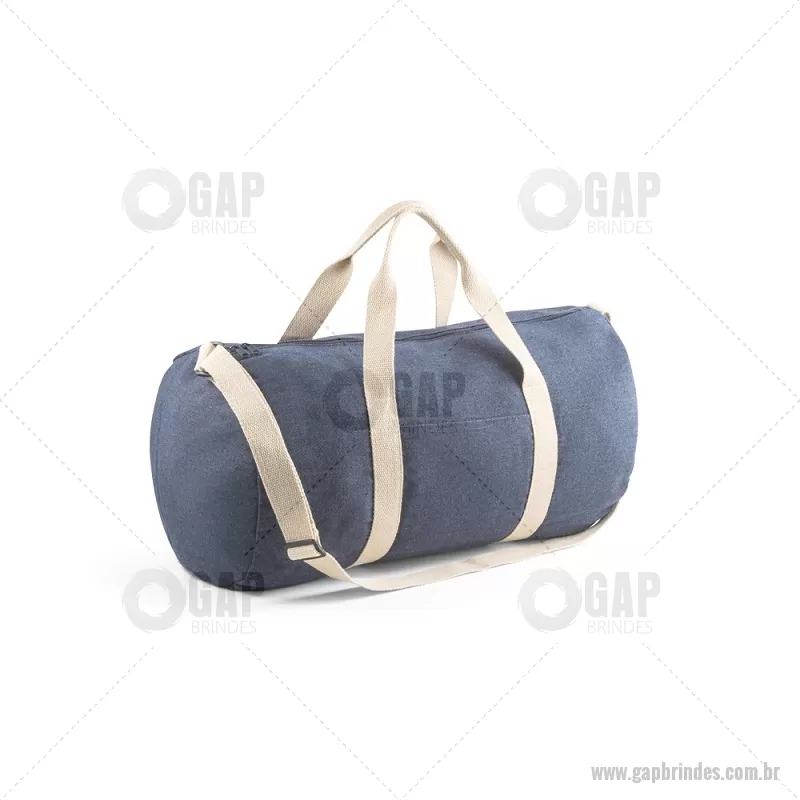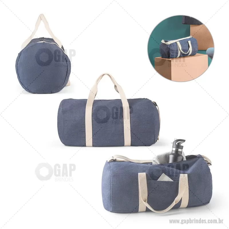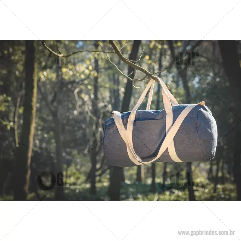 Bolsa esportiva ou viagem em denim reciclado (300 g/m²) Sacola esportiva ou viagem em denim reciclado (300 g/m²). Contém bolso frontal, fecho duplo e costuras reforçadas. Possui alças em webbing de algodão e alça de ombro ajustável até 130cm. Capacidade até 25 L. Ø260 x 480 mm Peso do Produto (g.): 249 - - GAPBOL043