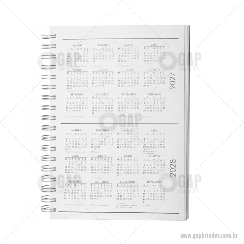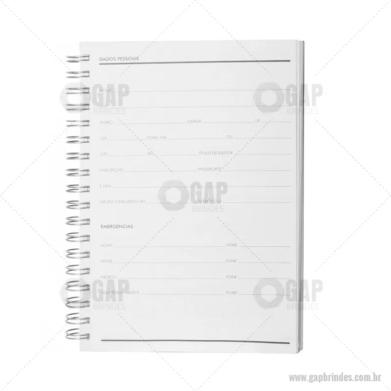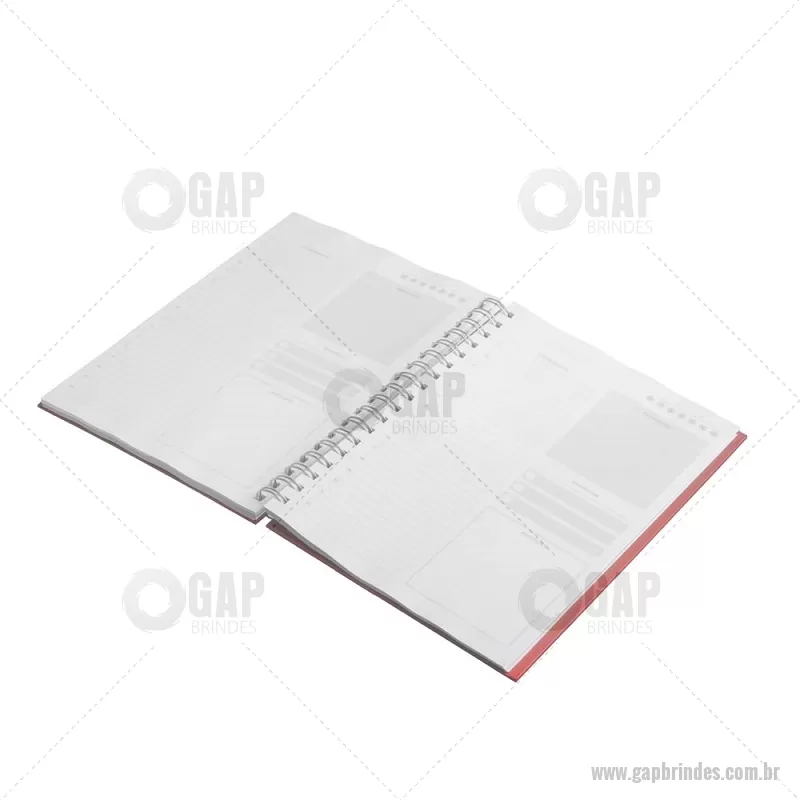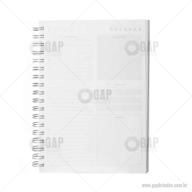 Caderno planner em espiral com capa rígida em Percalux de 2 mm. Possui 90 folhas brancas de 95 g/m² com layout de planner, ideais para organização e controle da rotina. Inclui páginas de dados pessoais, calendários de 2025 a 2028 e espaços para anotações mensais. - - GAPCAD034