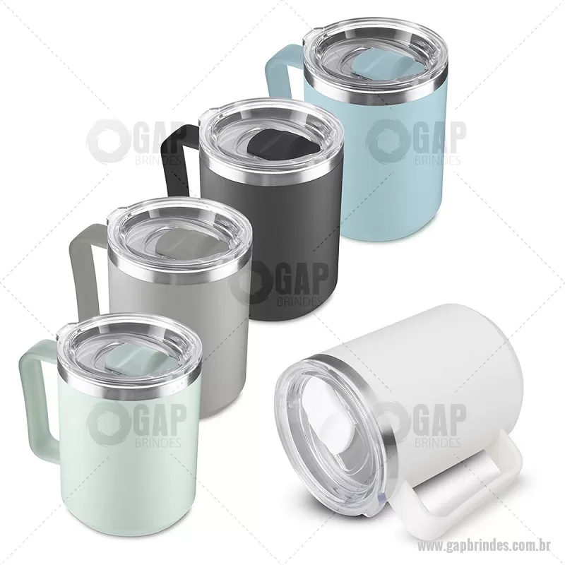 Caneca com capacidade de 450 ml, produzida em plástico PP com interior em inox 304, auxiliando na conservação da temperatura do líquido. Possui alça ergonômica e tampa plástica com vedação de encaixe, proporcionando praticidade e conforto no uso diário. - - GAPCAN107