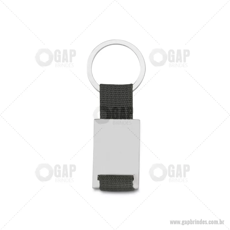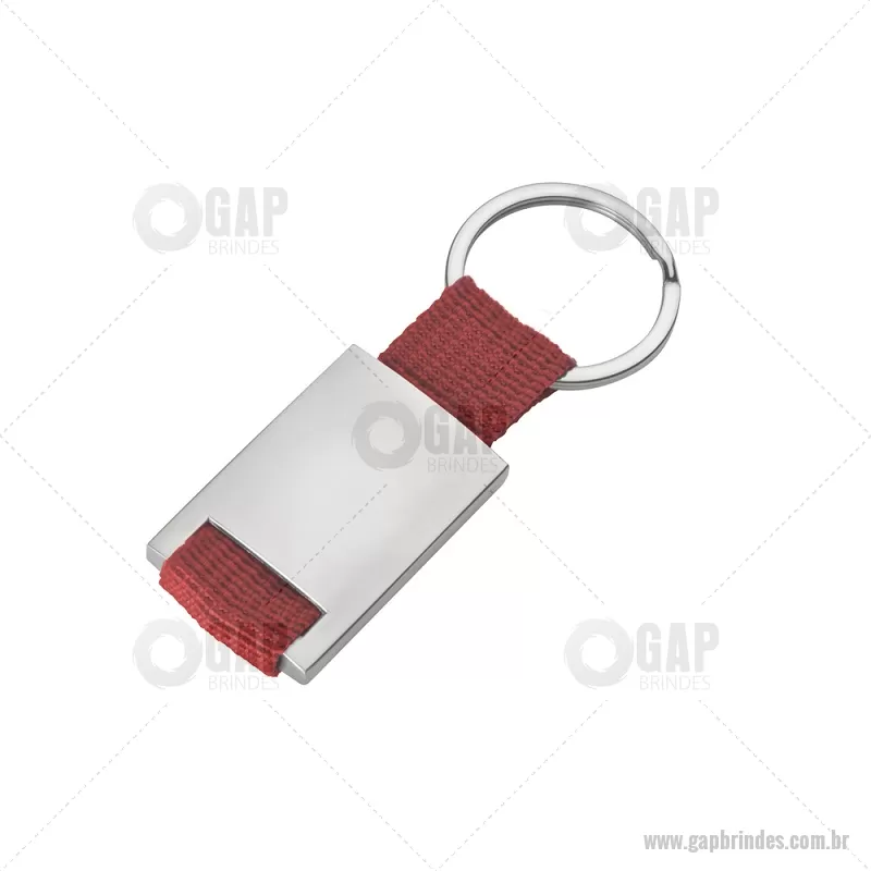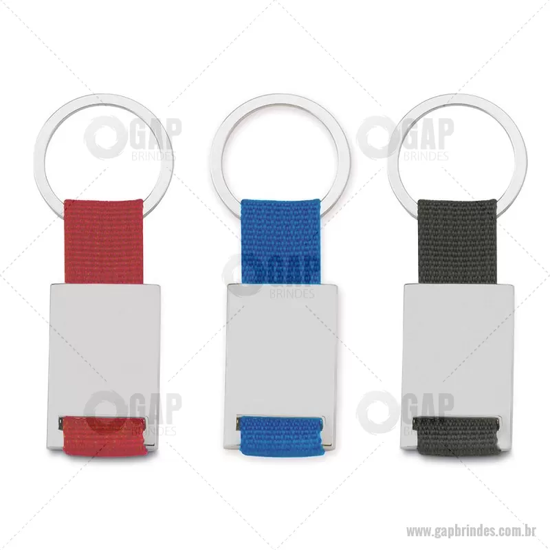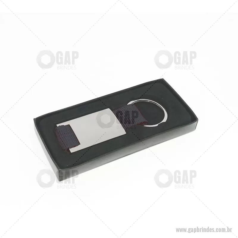 Chaveiro de metal retangular com detalhes em nylon + caixa com berço aveludado. Obs.: Frente e versão são iguais. Dimensão Produto: 8,5x3,4cm (AxL) Peso do Chaveiro: 0,025kg Peso do berço aveludado: 9g - - GAPCHV214