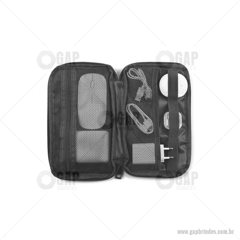 Bolsa organizadora em poliéster reciclado 600D de alta densidade com compartimento principal espaçoso para acessórios tecnológicos Bolsa organizadora para acessórios tecnológicos, recomendada para cabos, carregadores e pequenos dispositivos. Composta por poliéster reciclado 600D de alta densidade e forro em poliéster reciclado 210D. O compartimento principal contém vários bolsos para organizar individualmente todos os seus acessórios de maneira personalizada e funcional. Medidas: 220 x 130 x 25 mm Peso do Produto (g.): 72 - - GAPEMB047