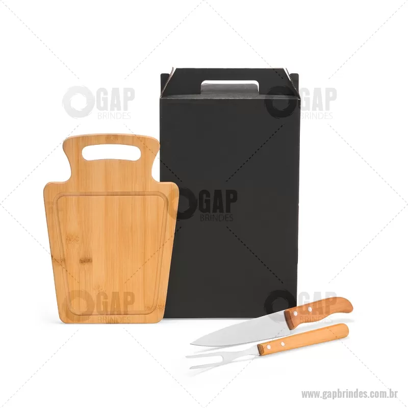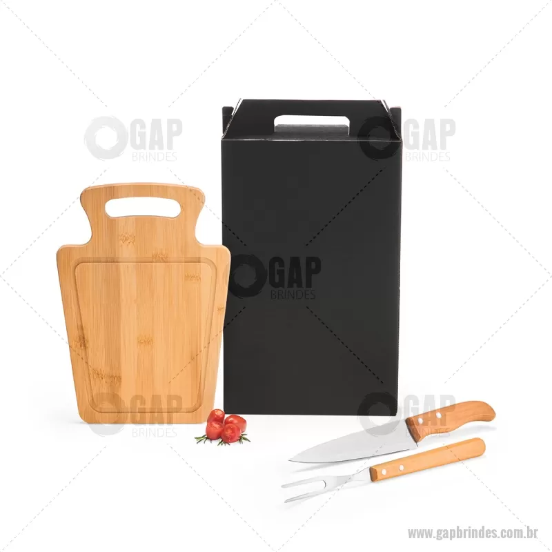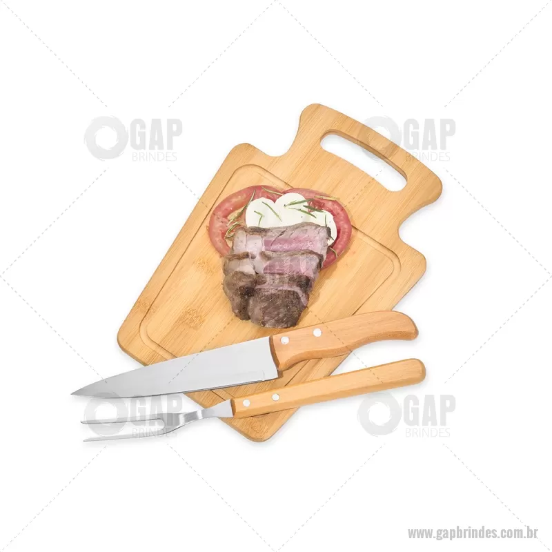Conjunto Para Churrasco Em Bambu / Madeira / Inox - 3 Pçs Composto por tábua em Bambu com 30x21x1,2 cm; faca 7'' e garfo em Madeira/Inox. Dimensões do Produto Tábua: 30x21x1,3 cm Sugestão de Personalização Uma gravação a Laser na petisqueira e lâmina da faca; uma gravação em Silk/Digital na caixa. Embalagem : Caixa Preta 40x21,8x4,5 cm (AxLxP) Peso: 619 g (com embalagem) - - GAPKCH095