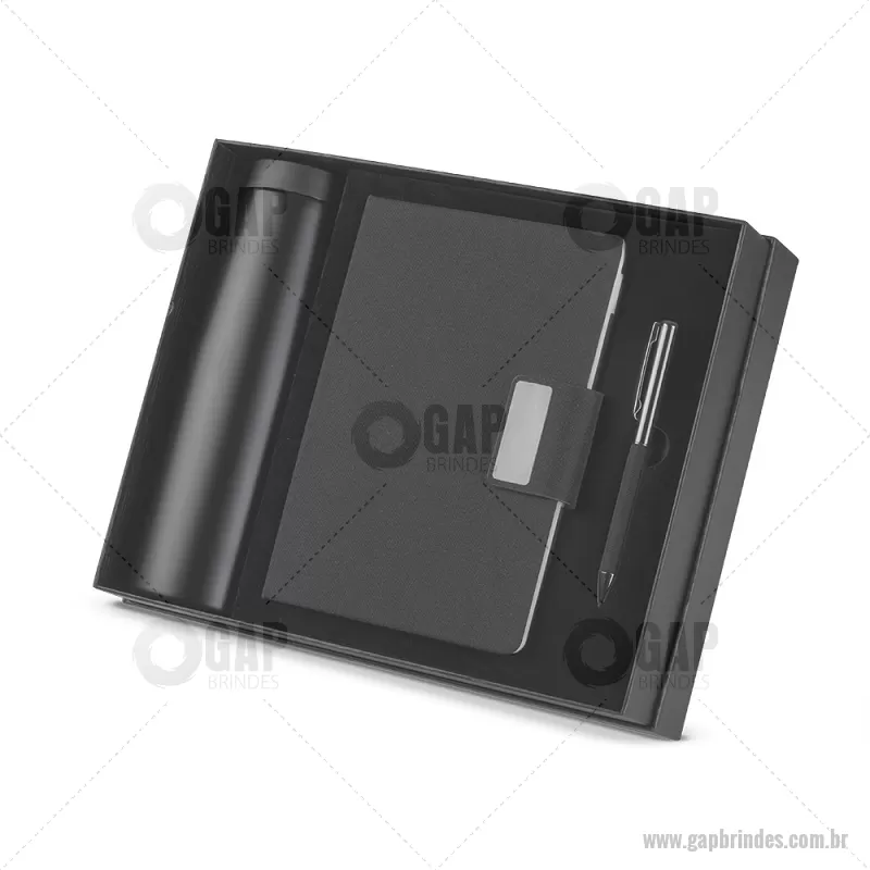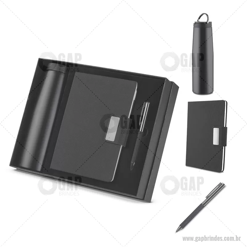 Kit escritório Caderno, Garrafa e Caneta Metalica Conjunto composto por caderno em material RPET com fechamento magnético,com 100 páginas, caneta modelo twist com detalhe em tecido RPET preto e garrafa de parede dupla em inox (304 interno e 201 externo), com capacidade de 550ml. Acompanha caixa presenteável. Peso do Produto: 0,256kg (Caderno) Peso do Produto: 0,277kg (Garrafa) Peso do Produto: 0,019kg (Caneta) Peso do Produto: 0,491kg (Caixa) Dimensão do Produto: 23,5x7,1cm (Garrafa) Dimensão do Produto: 21x14,5cm (Caderno) Dimensão do Produto: 7,6x30x24,7cm (Estojo presenteável) - - GAPKES083