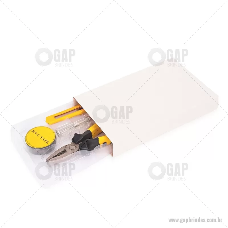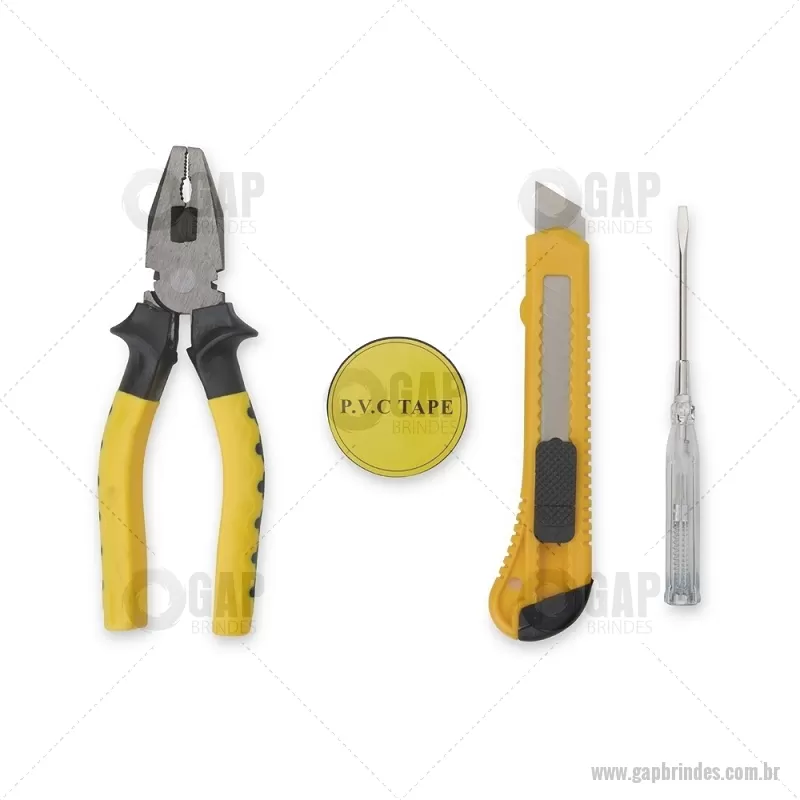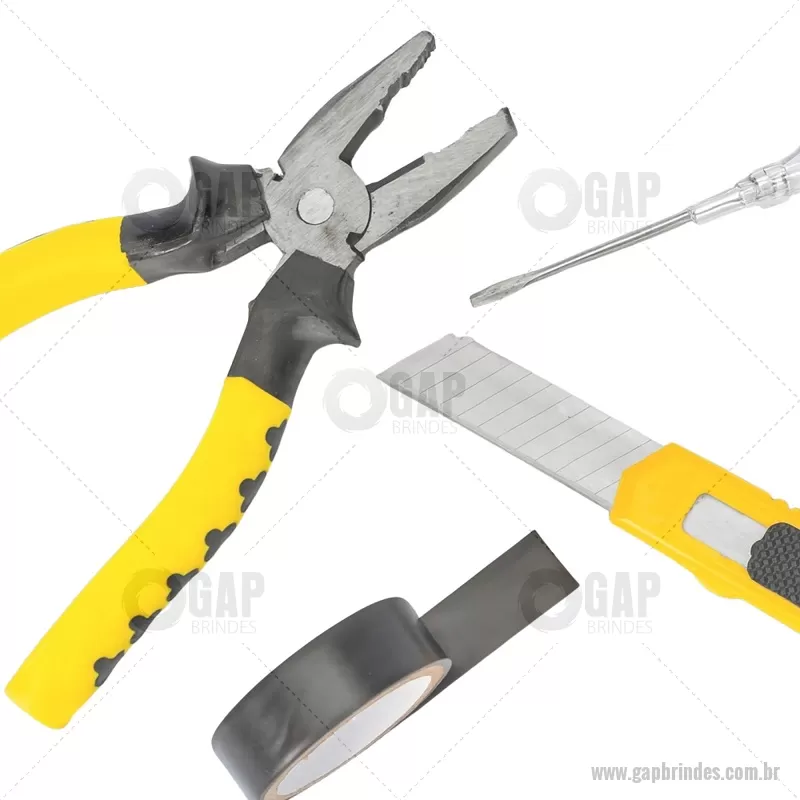 Kit de ferramentas compacto para uso diário, composto por chave de fenda teste, estilete, alicate e fita PVC. Todas as peças possuem acabamento em plástico resistente, oferecendo praticidade, conforto e durabilidade para pequenos reparos e imprevistos do dia a dia. - - GAPFER066