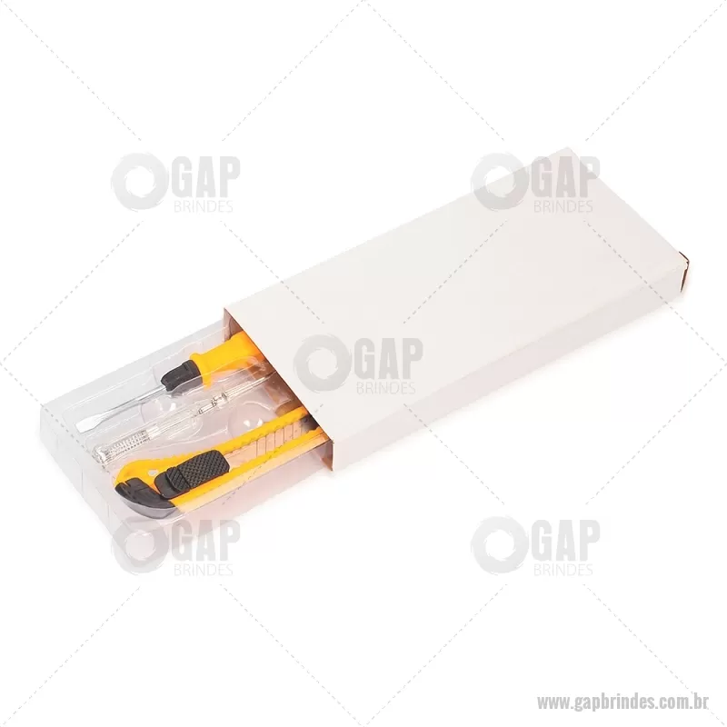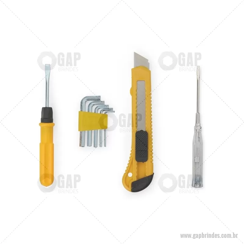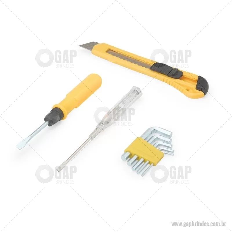 Kit de ferramentas compacto e funcional, ideal para pequenos reparos do dia a dia. Inclui estilete, chave de fenda teste, jogo de chaves Allen com 5 medidas e chave dupla com pontas fenda e Phillips. Produzido com acabamento em plástico resistente, oferece durabilidade e praticidade para resolver imprevistos com facilidade. - - GAPFER067