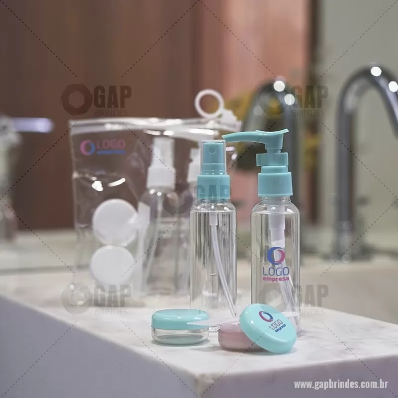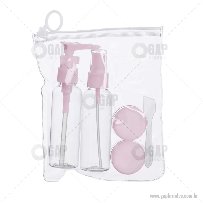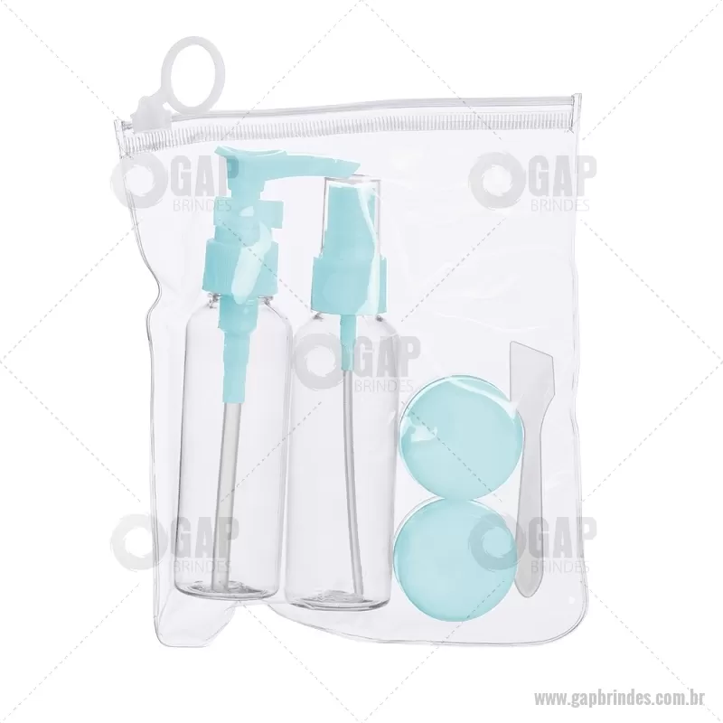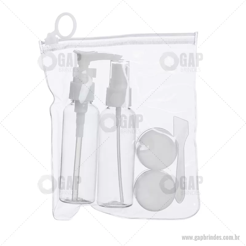 Kit Viagem 5 Peças Descrição: Kit viagem 5 peças em estojo ziplock. Contém frasco de 70ml com tampa spray; frasco de 70 ml com tampa pump; 2 potes de 10ml com tampa rosqueável e mini espátula fosca. Frascos plásticos e estojo em pvc com puxador plástico. Altura : 17,2 cm x Largura : 14,5 cm Peso aproximado (g): 61 - - GAPKVG017