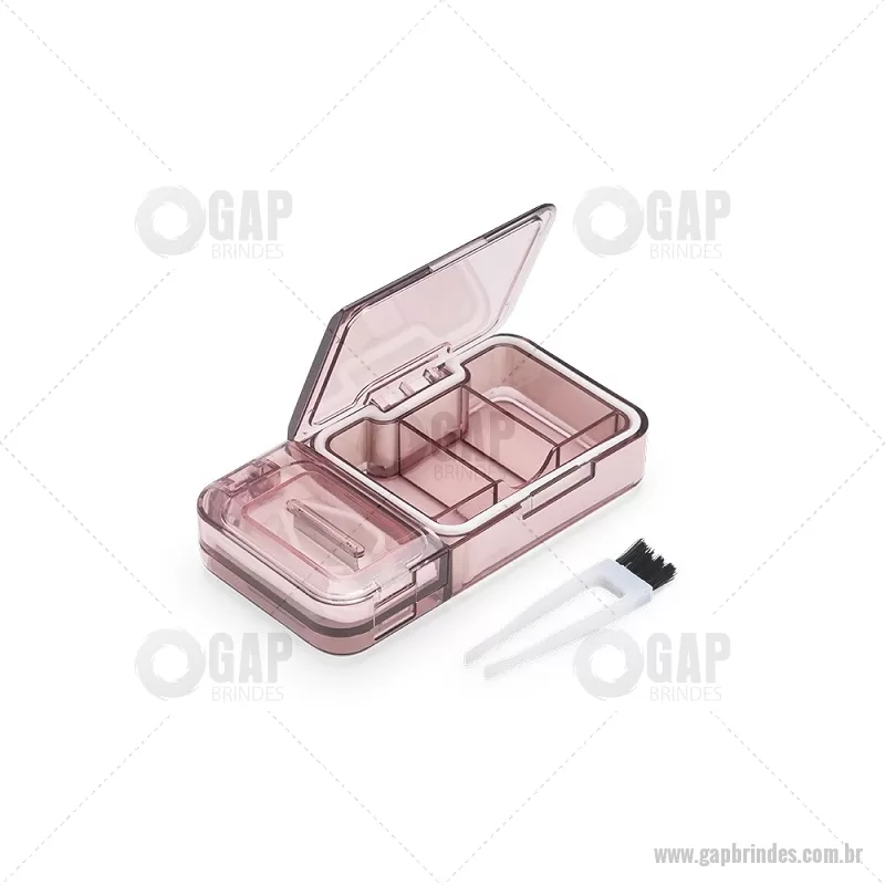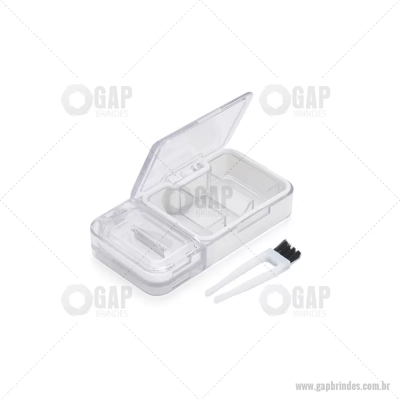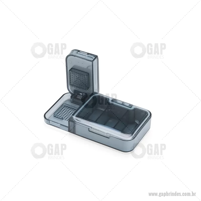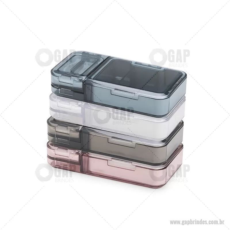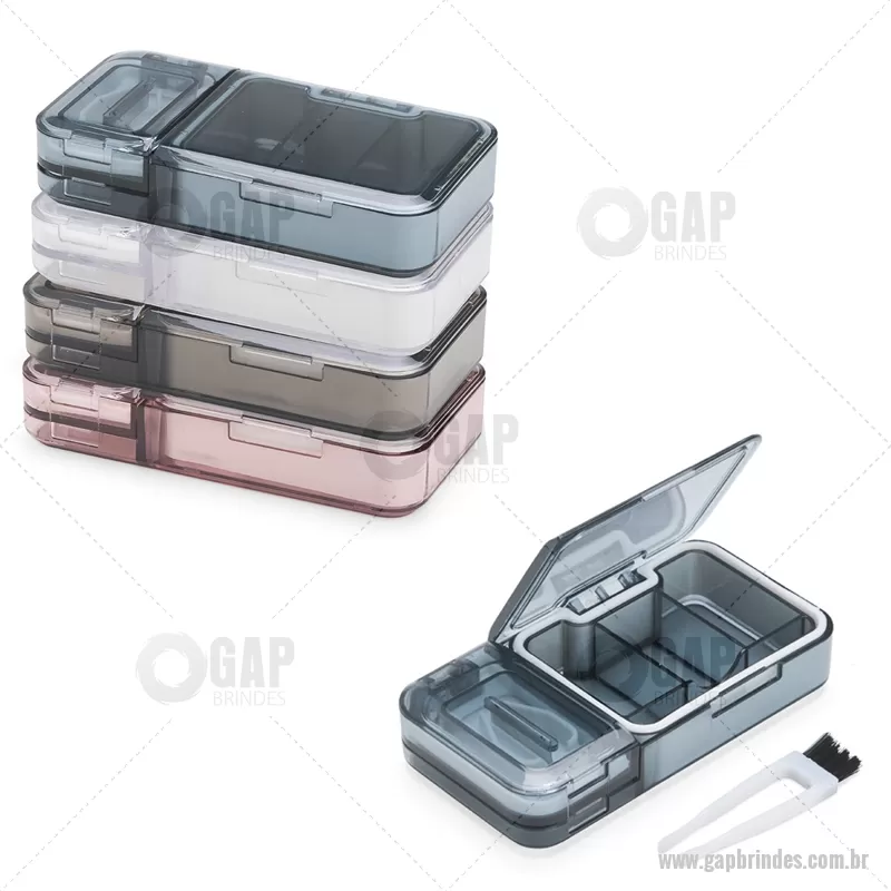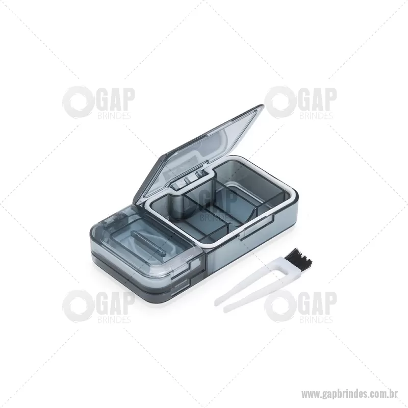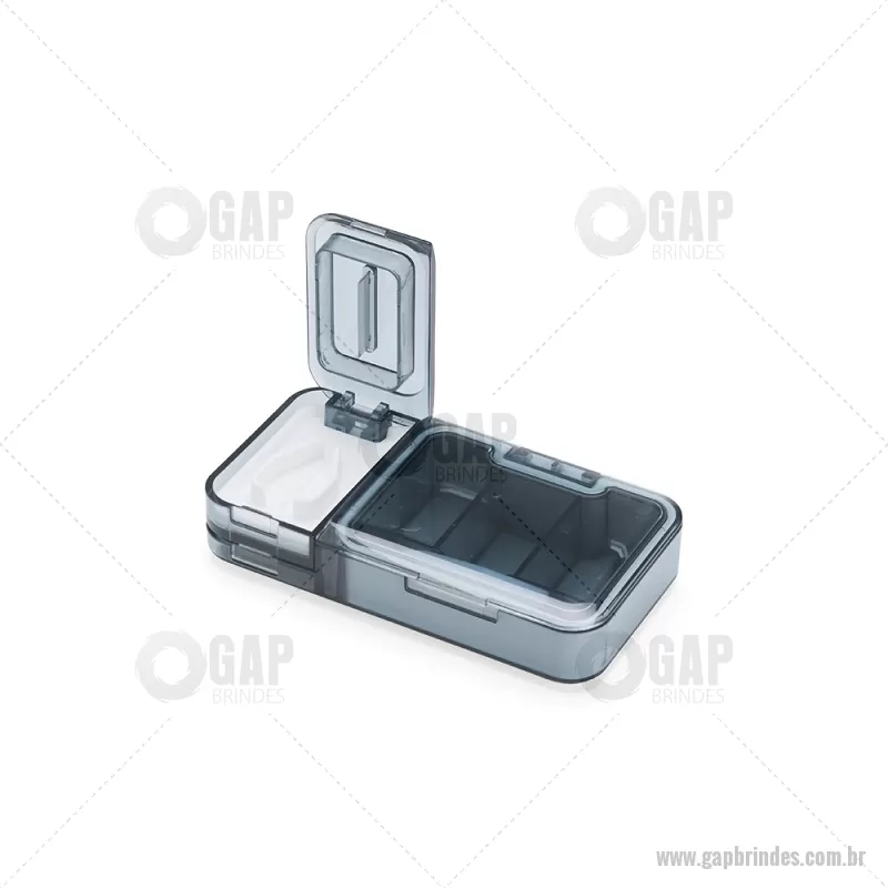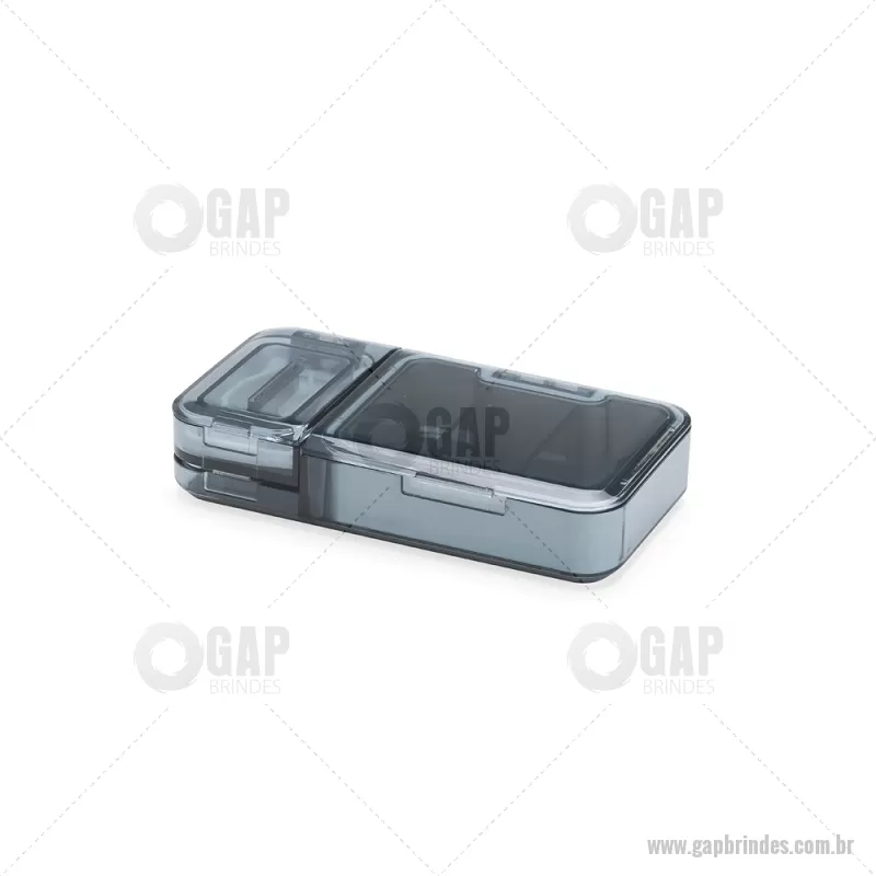 Porta Comprimidos Plástico Descrição: Porta-comprimidos multifuncional em plástico. Possui três divisórias com capacidade de até 10ml cada, além de dois compartimentos especiais: um cortador de comprimidos na parte superior e outro para trituração, localizado na parte inferior. Largura : 6 cm x Espessura : 2,5 cm x Comprimento : 12 cm Peso aproximado (g): 107 - - GAPPCP017