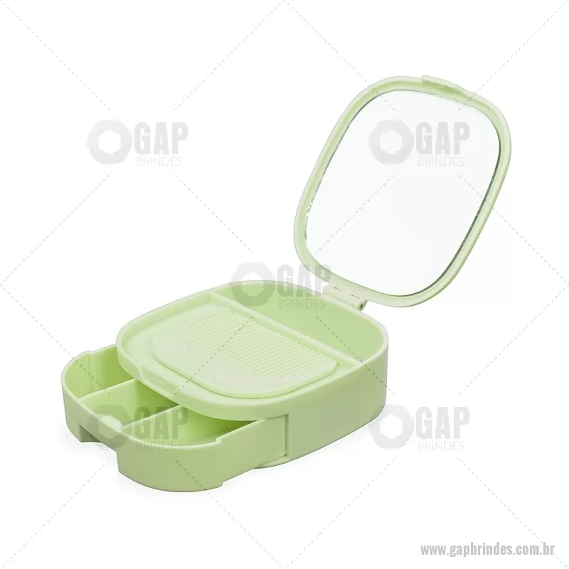 Porta-joias feito em plástico com espelho sem aumento na parte interna da tampa. Possui compartimentos internos de tamanhos variados e uma gaveta com três divisórias. Acompanha um pente compacto para cabelos. Altura : 3,5 cm x Largura : 9,9 cm x Comprimento : 9,9 cm Peso aproximado (g): 133 - - GAPFEM120