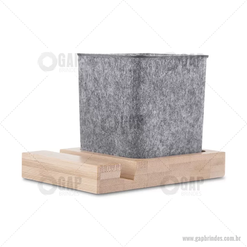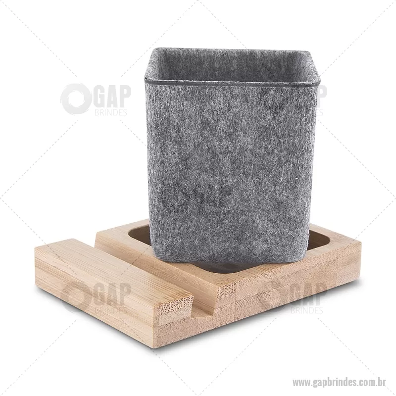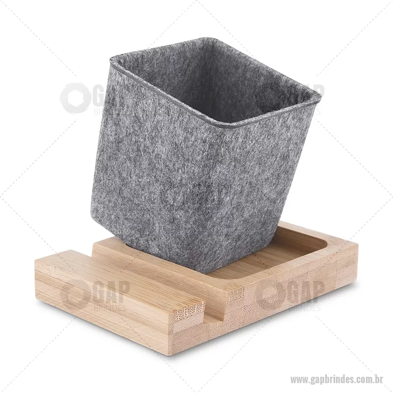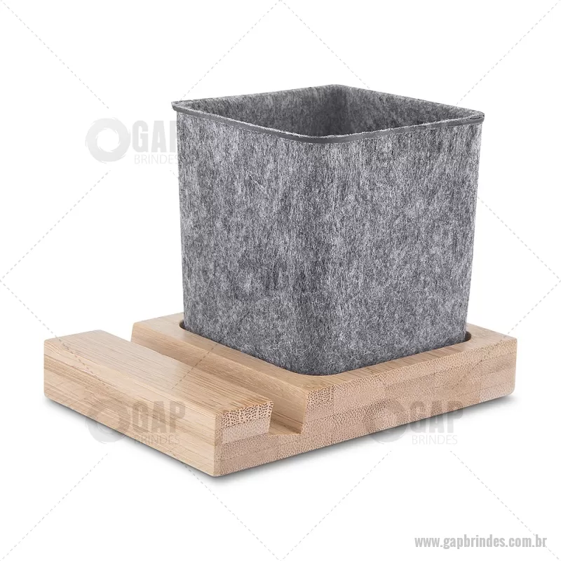 Porta objetos/smartphone em feltro e bambu Porta-objetos em feltro reciclado com suporte para celular em bambu. Prático e versátil, ideal para organizar canetas, lápis, marcadores e manter a mesa de escritório sempre funcional e elegante. Peso do Produto: 0,112kg Dimensão do Produto: (1,7x11,7x8,5cm) (Base em bambú) Dimensão do Produto: 8x6,5x6,5cm (Porta Caneta) - - GAPPC021